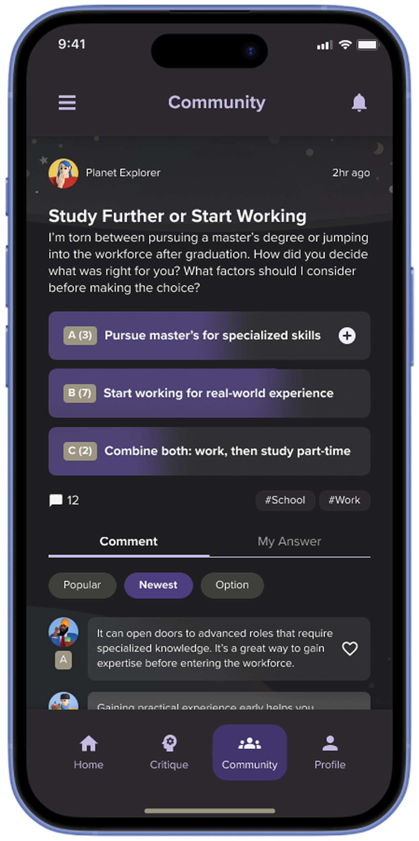 Designed Thinkiverse, a critical-thinking training app, leveraging AI for rapid user research and building high-fidelity Figma prototypes that deliver personalized critiques and community debate.